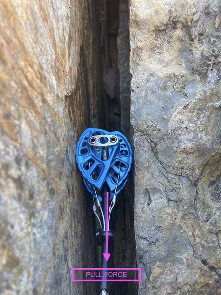 I think I’m in love with this piece of gear. It uses a logarithmic spiral to convert downward force into a normal force on the sides. Physically, it holds independent of the pull force, as shown in the next photo. The condition only takes into account the friction coefficient. It can work in perfectly parallel cracks witch is amazing.